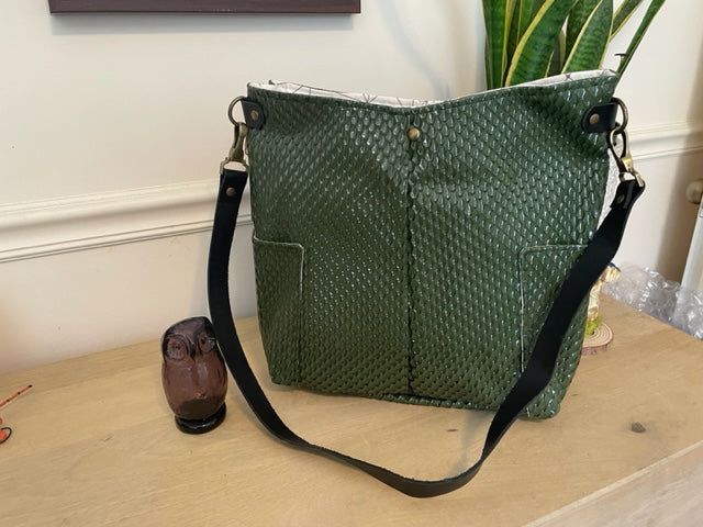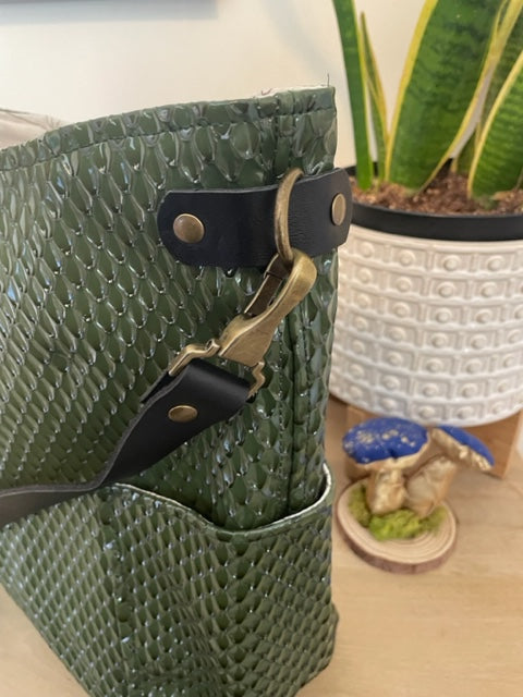 This bag is a very special dragon scale material (textured green vinyl) **No dragons were harmed in the making of this bag.
