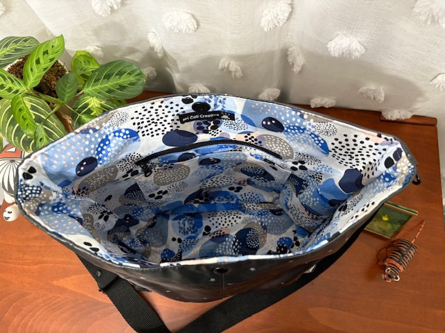 The Compass bags let you carry all you need with a casual, cool style. The Compass comes with two external pockets, internal zipper and slip pocket, magnetic snap and adjustable leather strap. This one of a kind comes in black starry oilcloth exterior and colorful interior.